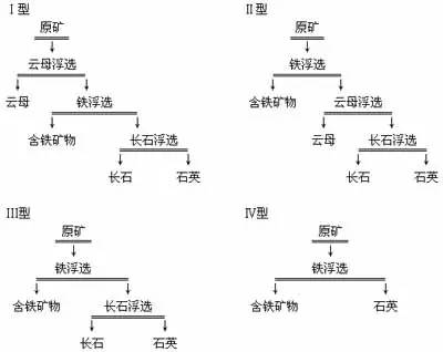 (1)先浮云母再浮含铁矿物然后浮长石。先用硫酸调整矿浆PH到3~4,用胺类捕收剂浮选云母,然后用盐酸调整矿浆PH到4~5,以磺化石油作捕收剂浮选含铁矿物,然后用氟氢酸调整PH到2~3,用胺作捕收剂,浮选长石。石英以尾矿形式产出(图Ⅰ型)。