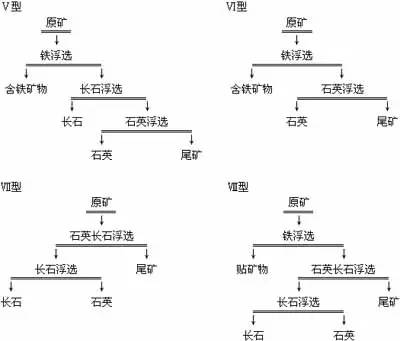 (8)浮铁矿物后再进行长石和石英混合浮选。它适用于含铁高的石英砂(图Ⅷ型)。